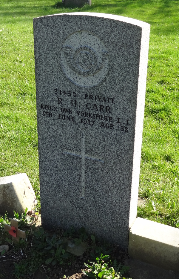 | CARR | RICHARD HECKLES | R H | 38 | 05/06/17 | Private | King's Own Yorkshire Light Infantry | C8424 |
