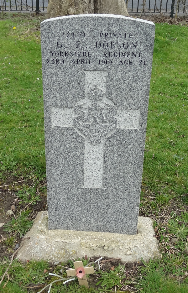 | DOBSON | GEORGE EDWARD | G E | 24 | 23/04/19 | Private | Yorkshire Regiment | C9444 |
